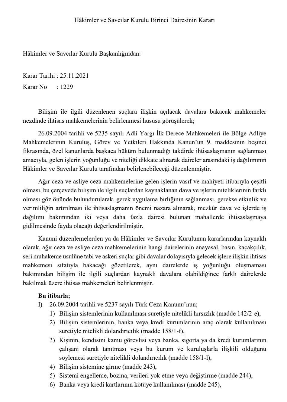BİLİŞİM SUÇLARINA BAKACAK MAHKEMELERE İLİŞKİN HSK KARARI