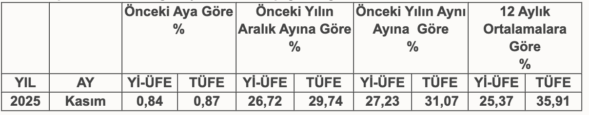 Kasım 2025 TÜFE (Tüketici Fiyat Endeksi) – Yİ-ÜFE (Yurt İçi Üretici Fiyat Endeksi) Oranları Türkiye İstatistik Kurumu tarafından belirlendi. Açıklanan verilere göre yeni oranlar aşağıdaki gibidir.