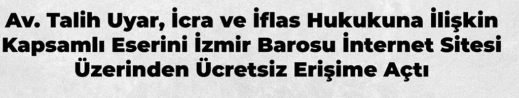 İzmir Barosu üyesi meslektaşımız Av. Talih Uyar, icra ve iflas hukukuna ilişkin olarak hazırladığı kapsamlı eserini, başta İzmir Barosuna kayıtlı avukatlar ve stajyer avukatlar olmak…