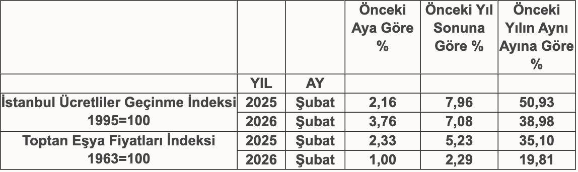 İTO tarafından, 2026 yılı Şubat ayında İstanbul’da; perakende fiyat hareketlerinin göstergesi olan İstanbul Ücretliler Geçinme İndeksi ile toptan fiyat hareketlerini yansıtan Toptan Eşya Fiyatları indeksi açıklanmıştır. Açıklanan verilere göre yeni oranlar aşağıdaki gibidir:Daha önceki tarihlere ilişkin İstanbul Ücretliler Geçinme İndeksi ile Toptan Eşya Fiyatları indeksi için Önemli Bilgiler klasörümüzde yer alan İTO Fiyat İndeksi Genel Tablo’ya bakınız.