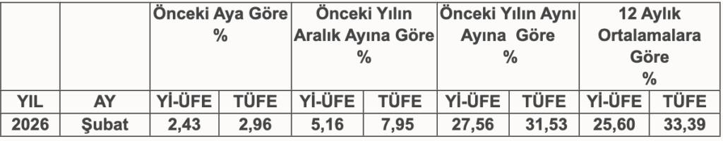 Şubat 2025 TÜFE (Tüketici Fiyat Endeksi) – Yİ-ÜFE (Yurt İçi Üretici Fiyat Endeksi) Oranları Türkiye İstatistik Kurumu tarafından belirlendi. Açıklanan verilere göre yeni oranlar aşağıdaki gibidir.